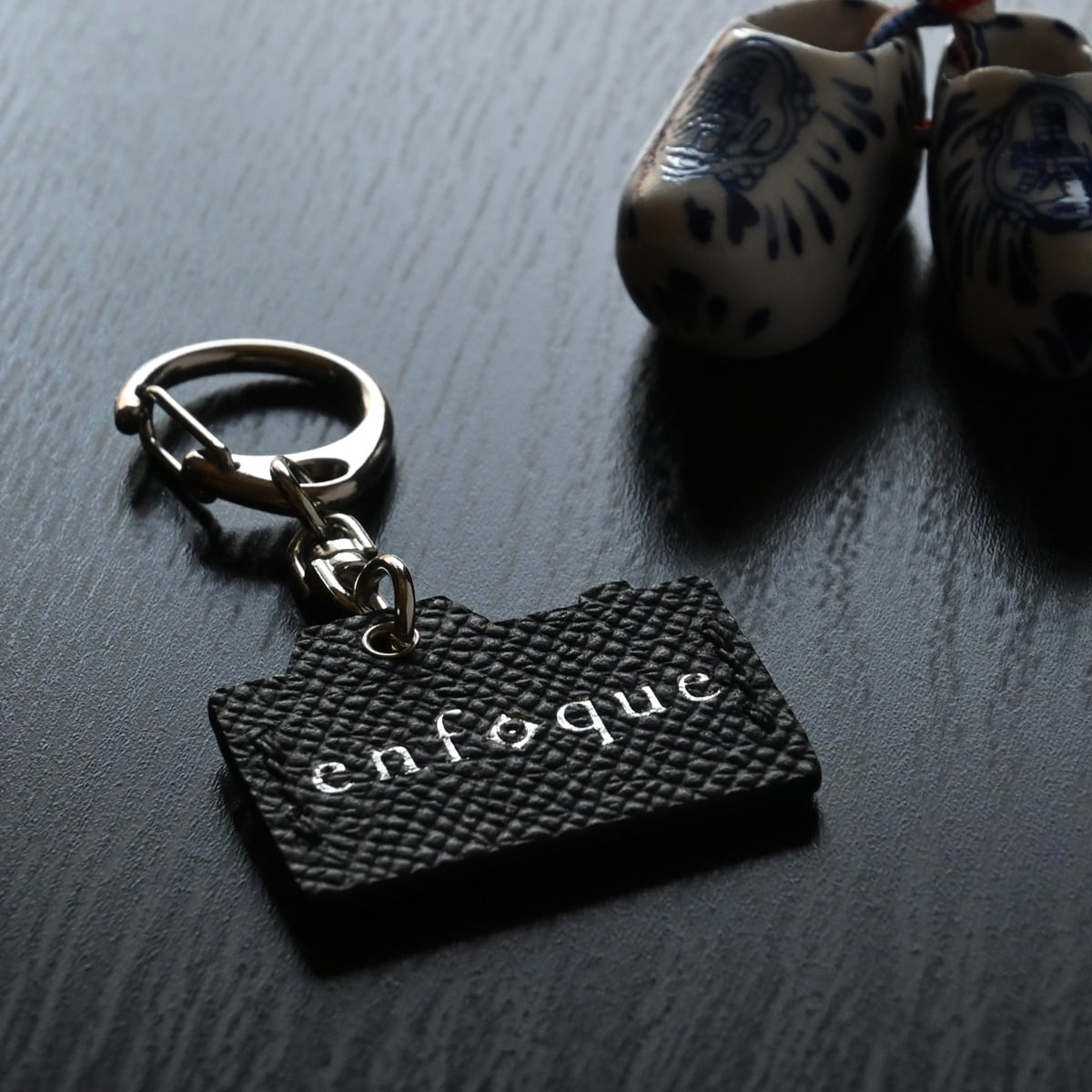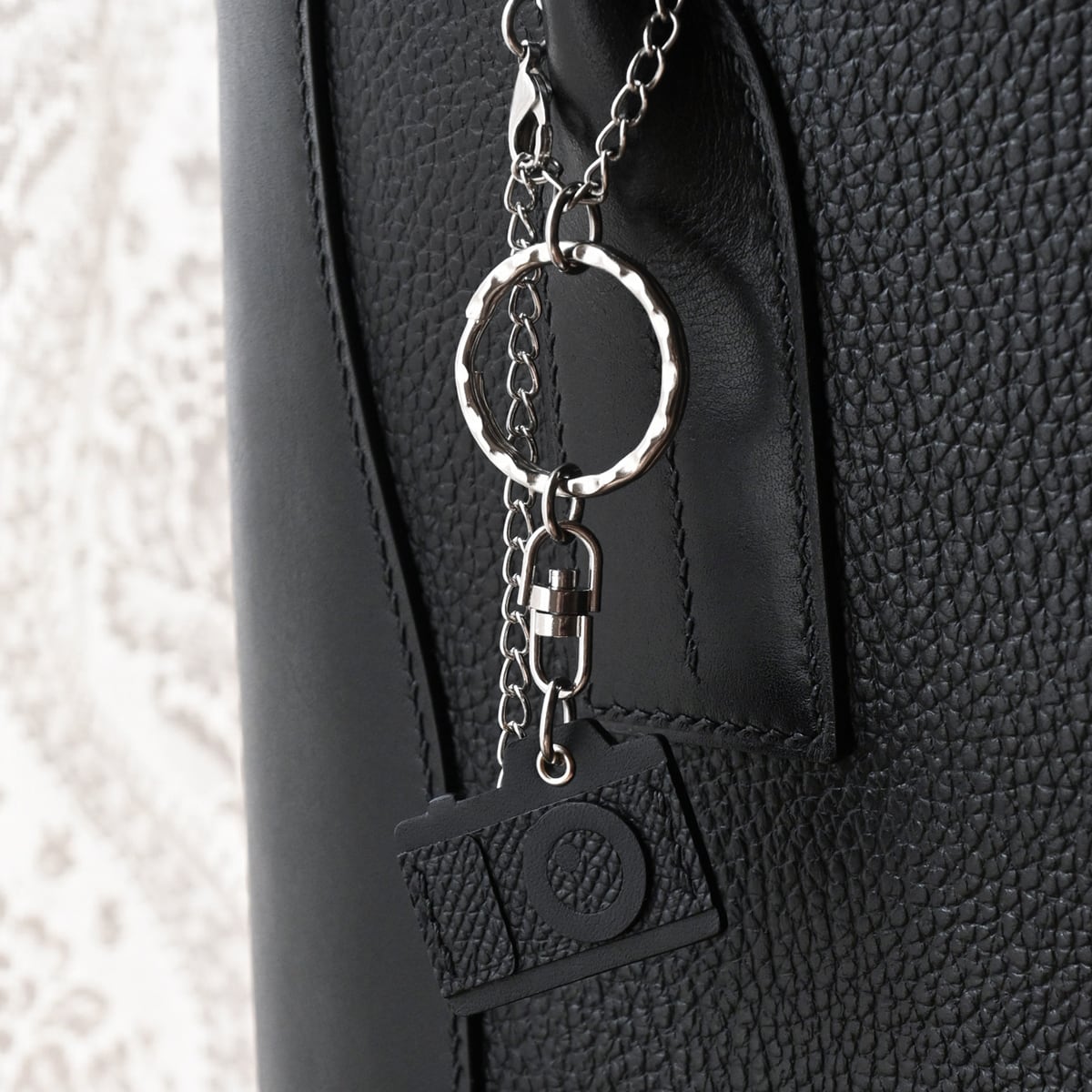 フレンチカーフレザー、ベースにマットブラックの革を使用して仕立てた“手縫い仕立てのカメラ型キーチェーン ブラックver”です。