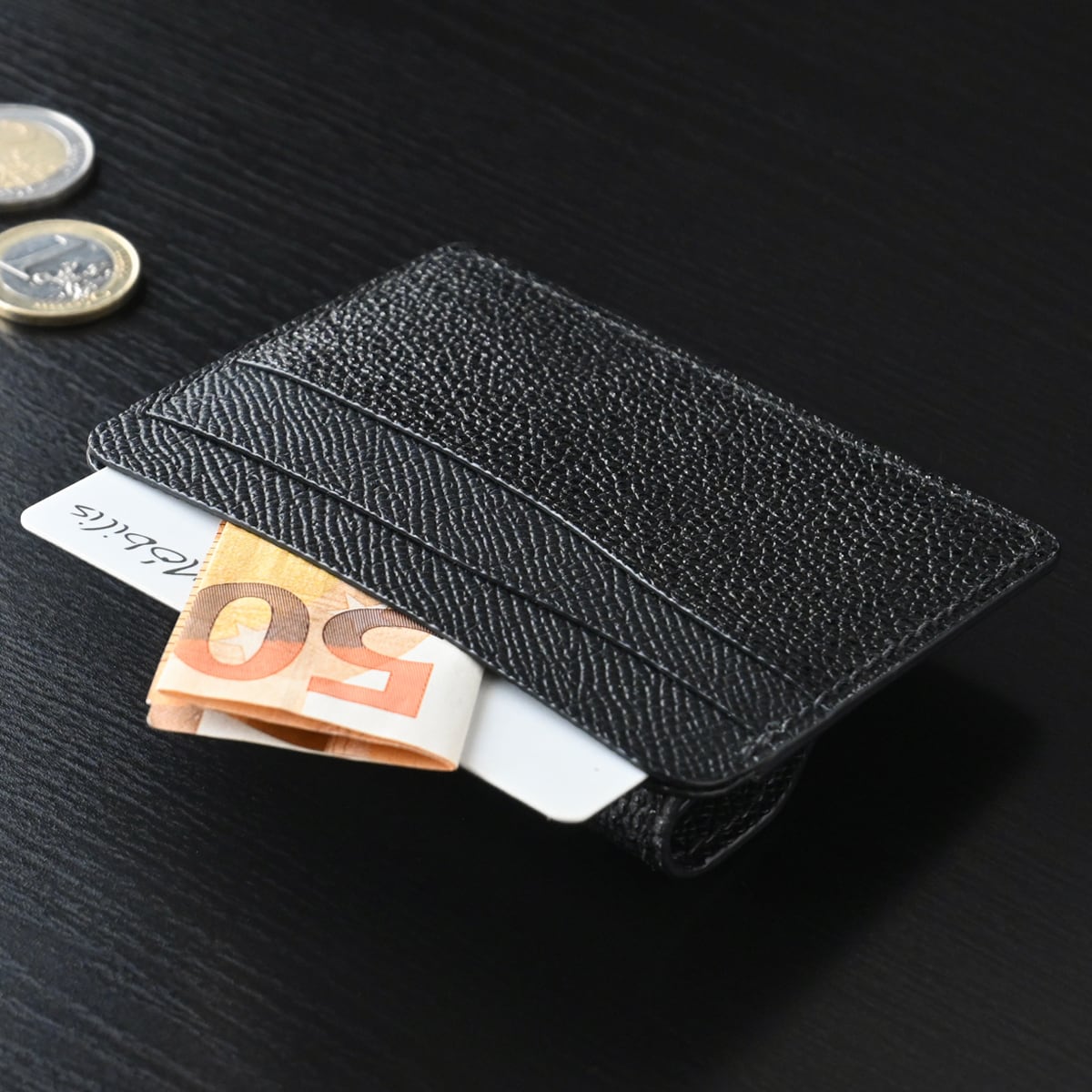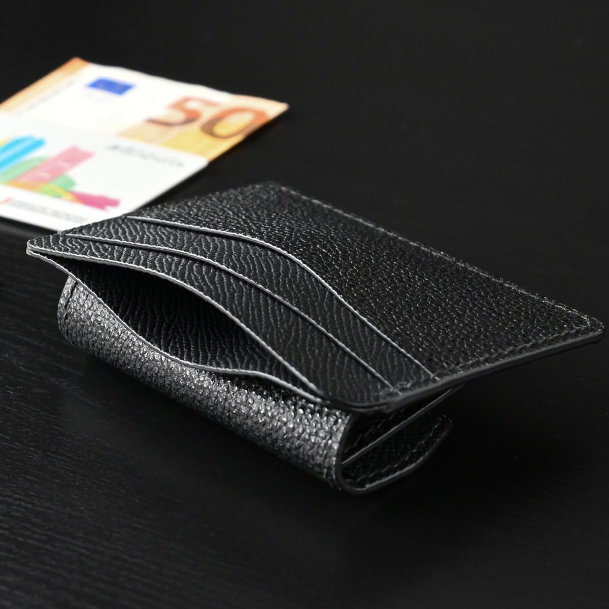 手縫い仕立てのコイン&カードケース 黒桟革&フレンチカーフレザー ブラック