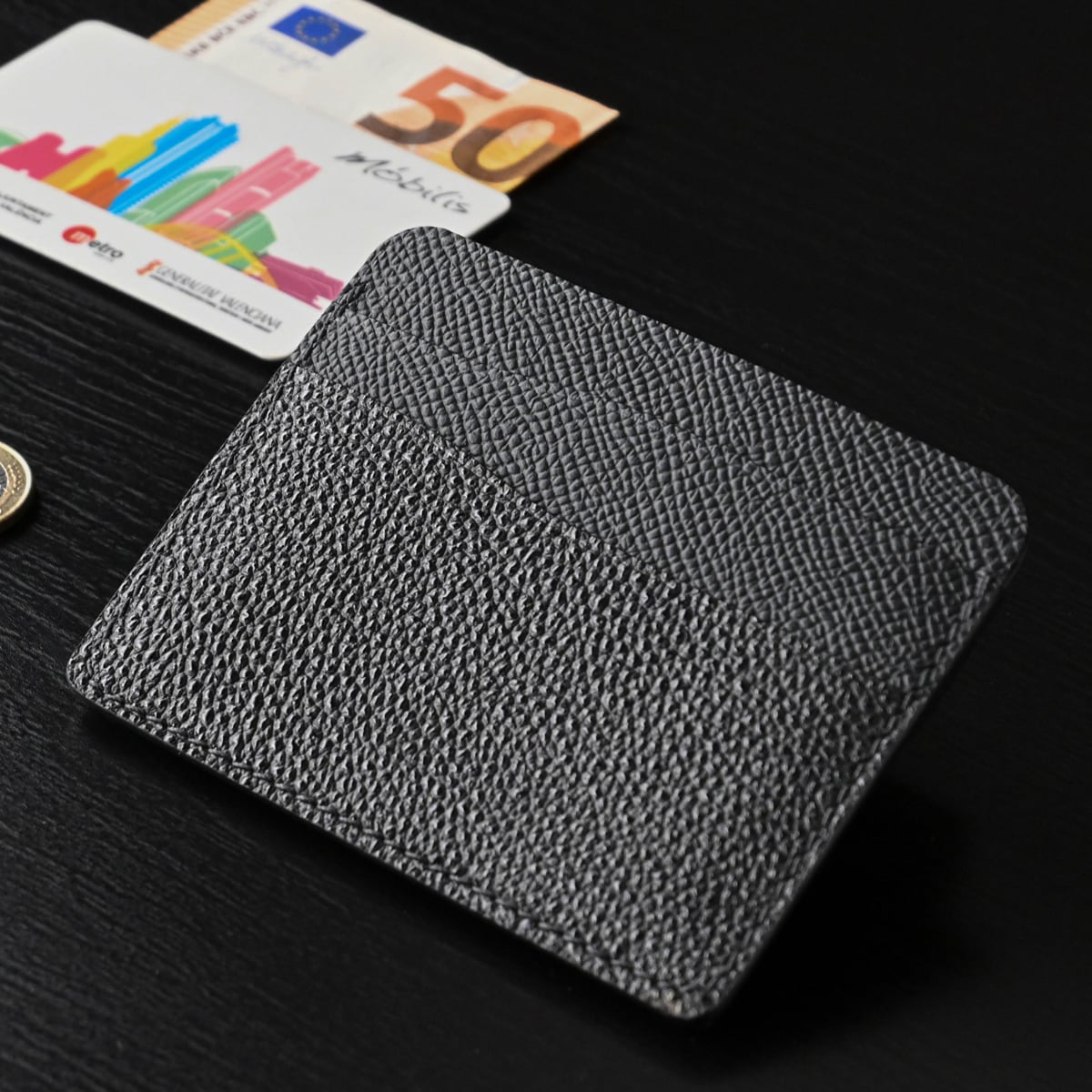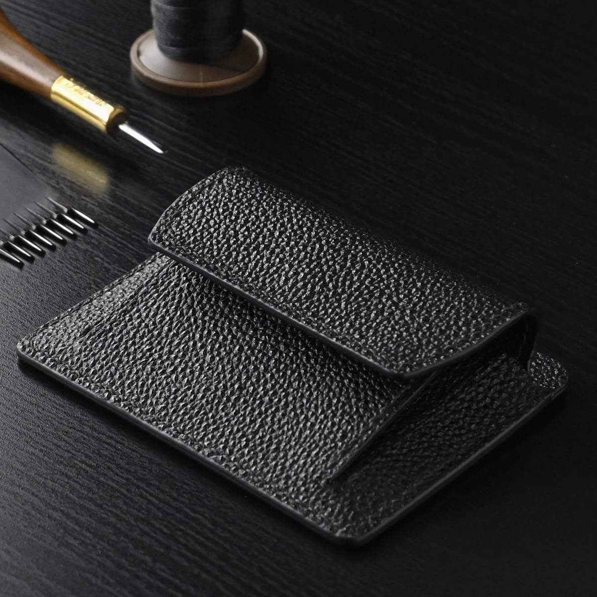 黒桟革、フレンチレザーを使い、手縫いにて仕立てた“コイン&カードケース”です。