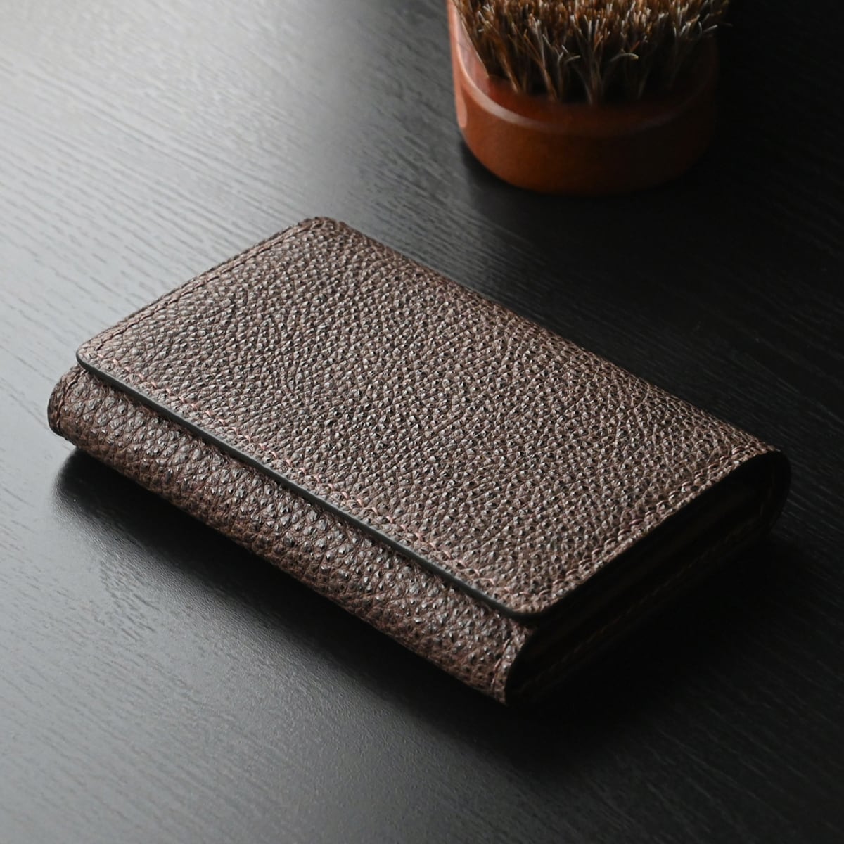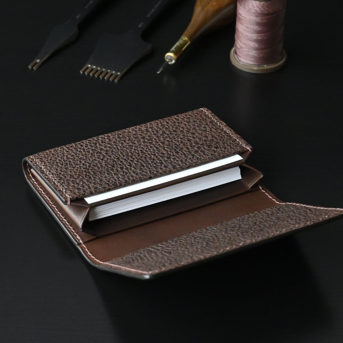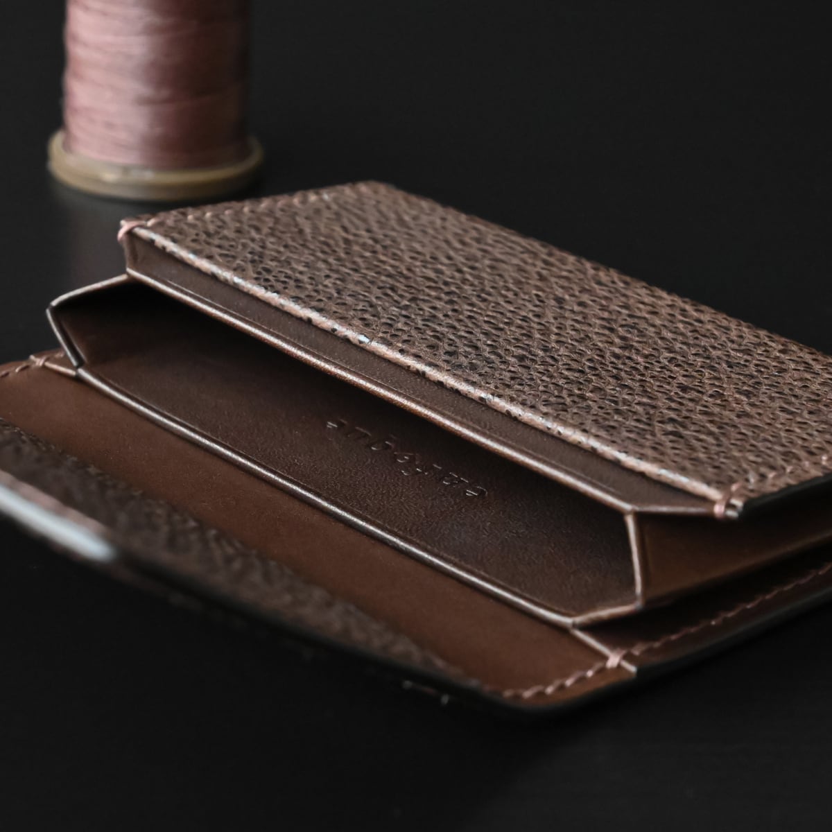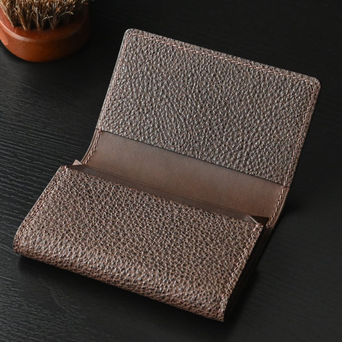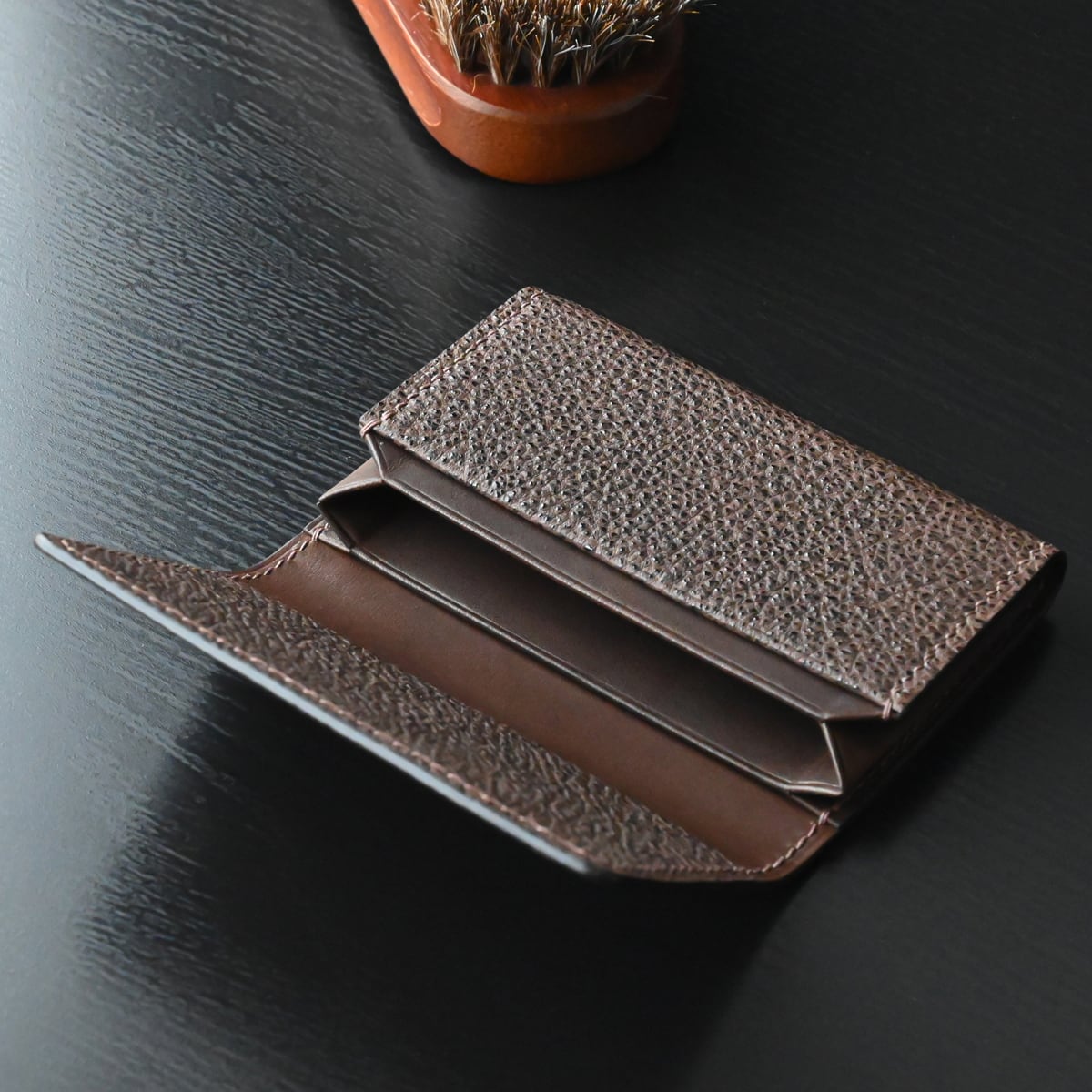 黒桟革(手揉み)とイタリアンレザーを使用、日本独自の技法と手縫いにて仕立てた“風琴マチ名刺入れ”です。