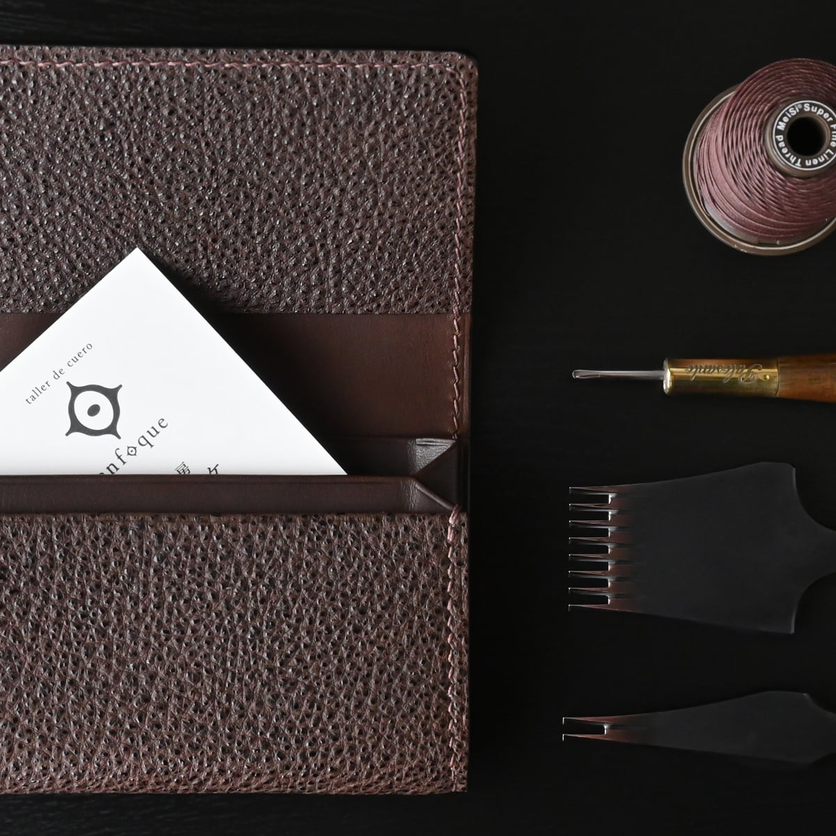 特徴として、日本の坂本商店が高い技術で創り出す”漆の光沢と高いシボ”を持つ黒桟革(手揉み)とイタリアンレザーを使用、全てパーツ裏面にも革を貼り、耐久性と共に贅沢に仕立てています。ワックス加工された高品質な手縫用麻糸にて手縫い、コバ面(裁断した革の端)は水性コバ仕上げ剤で仕上げています。