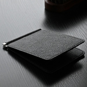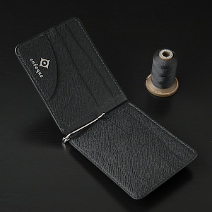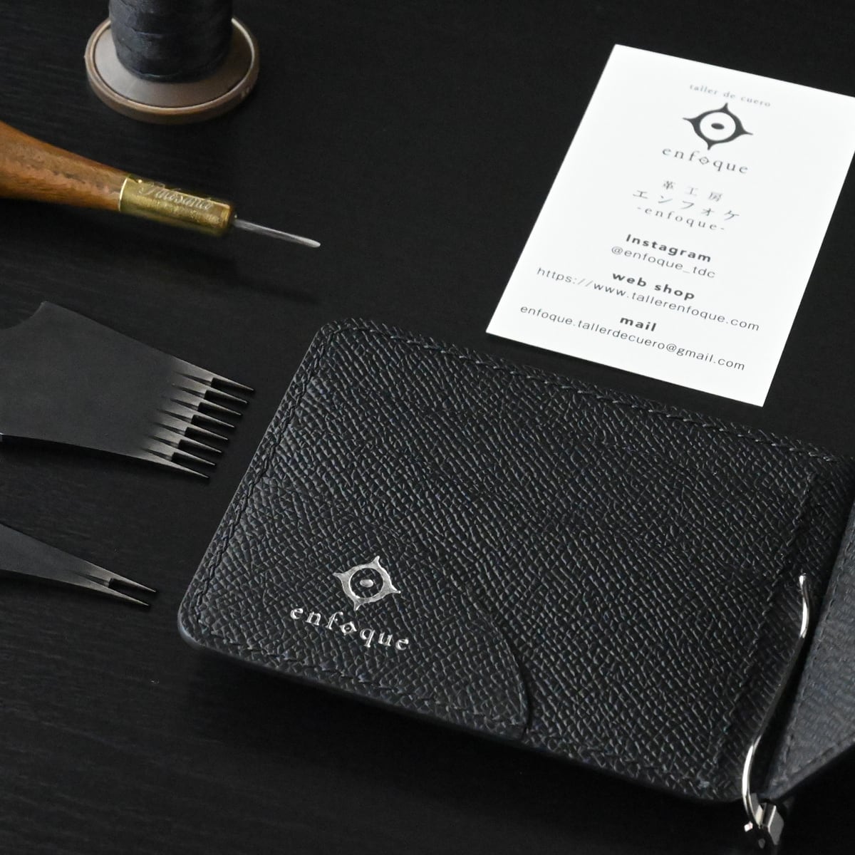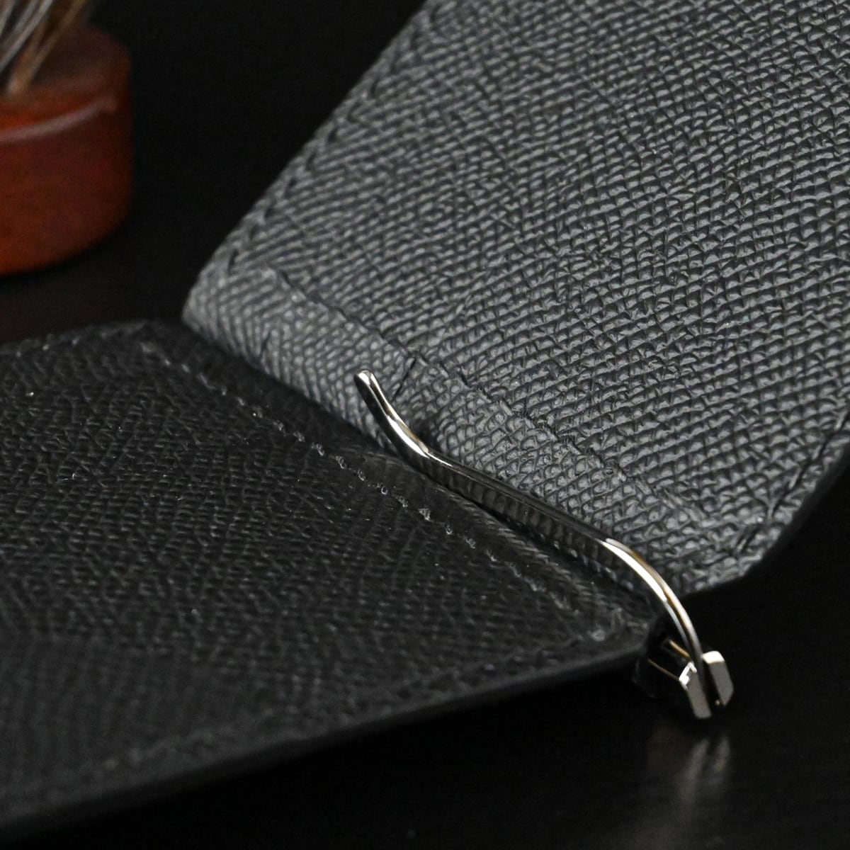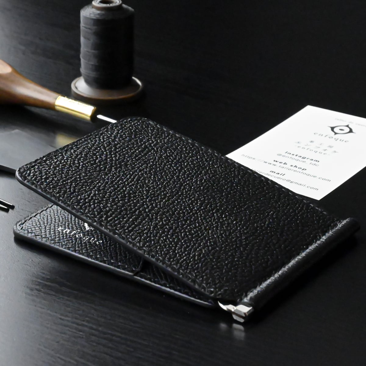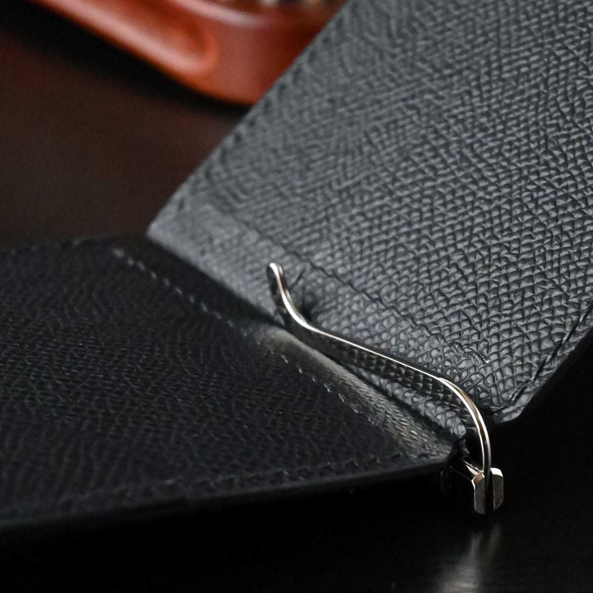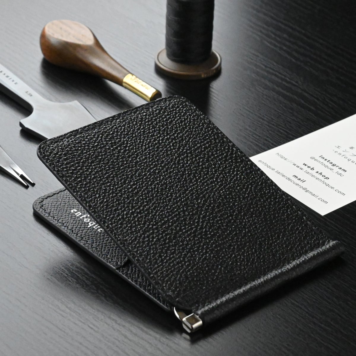 表に黒桟革、内部にフレンチレザーを使い、手縫いにて仕立てた“薄型のマネークリップ財布”(札ばさみ)です。
