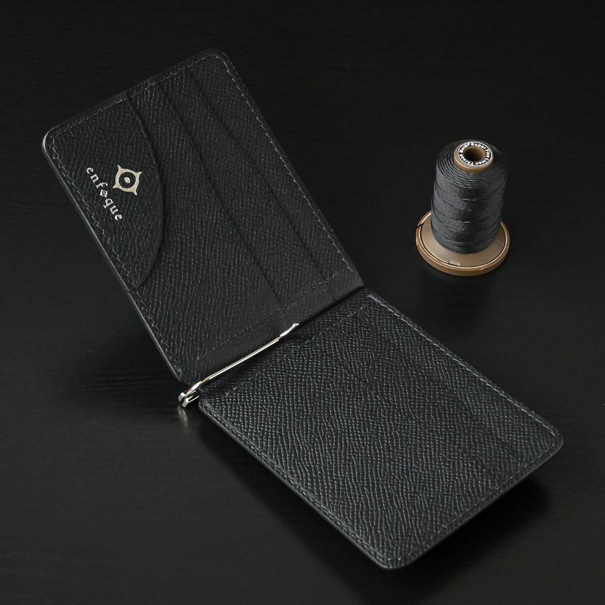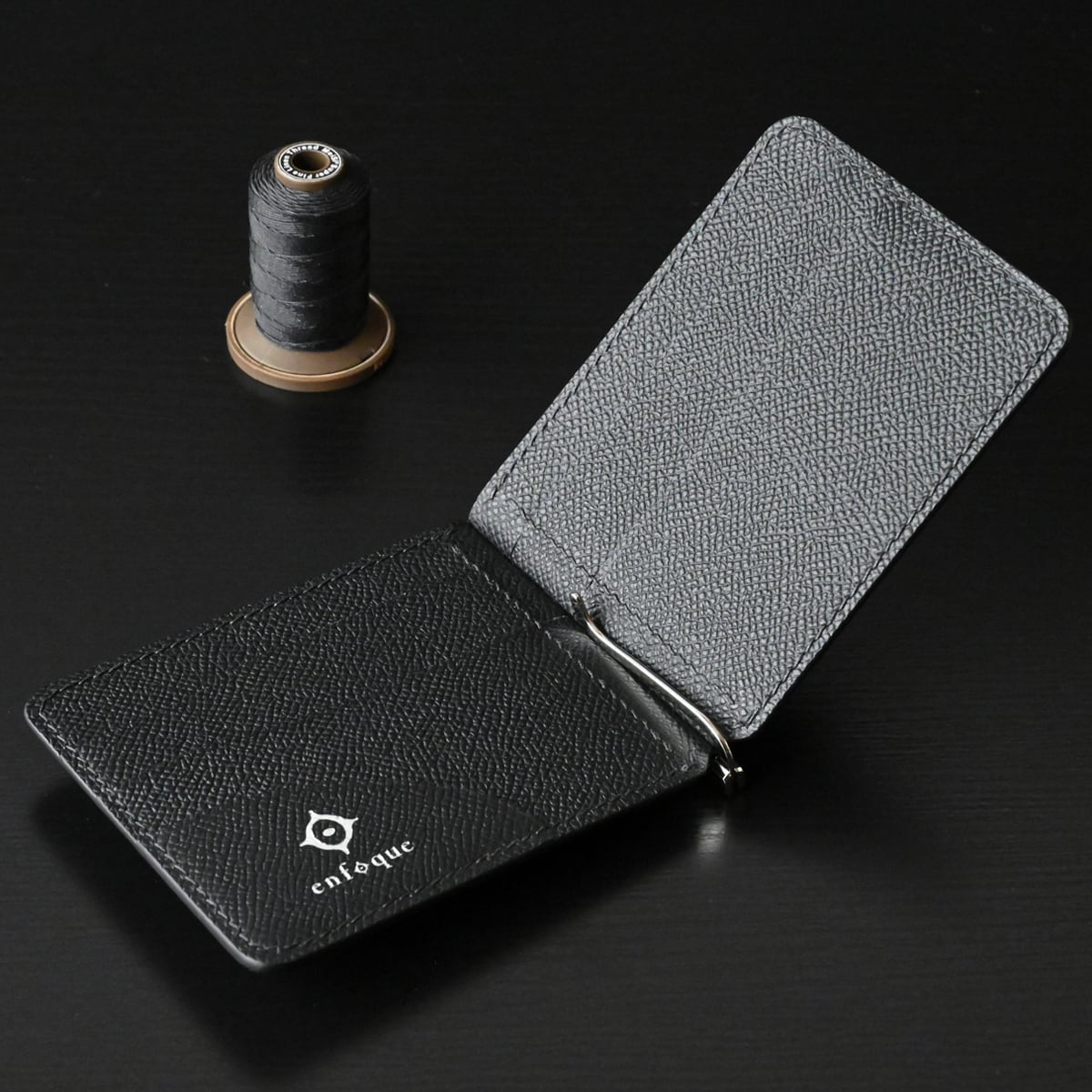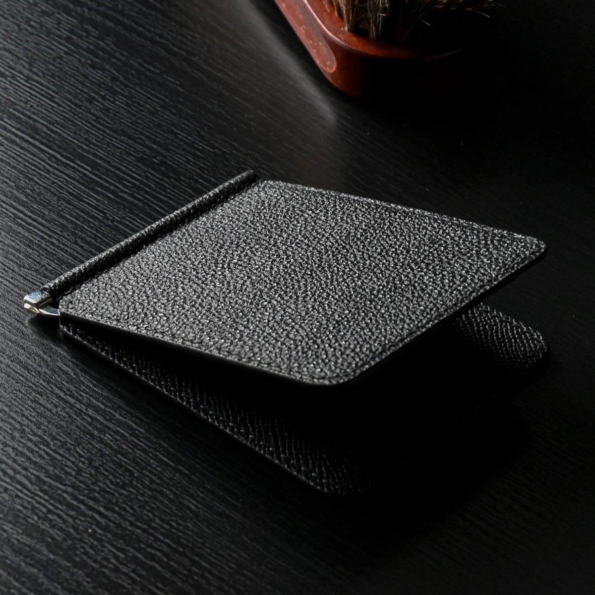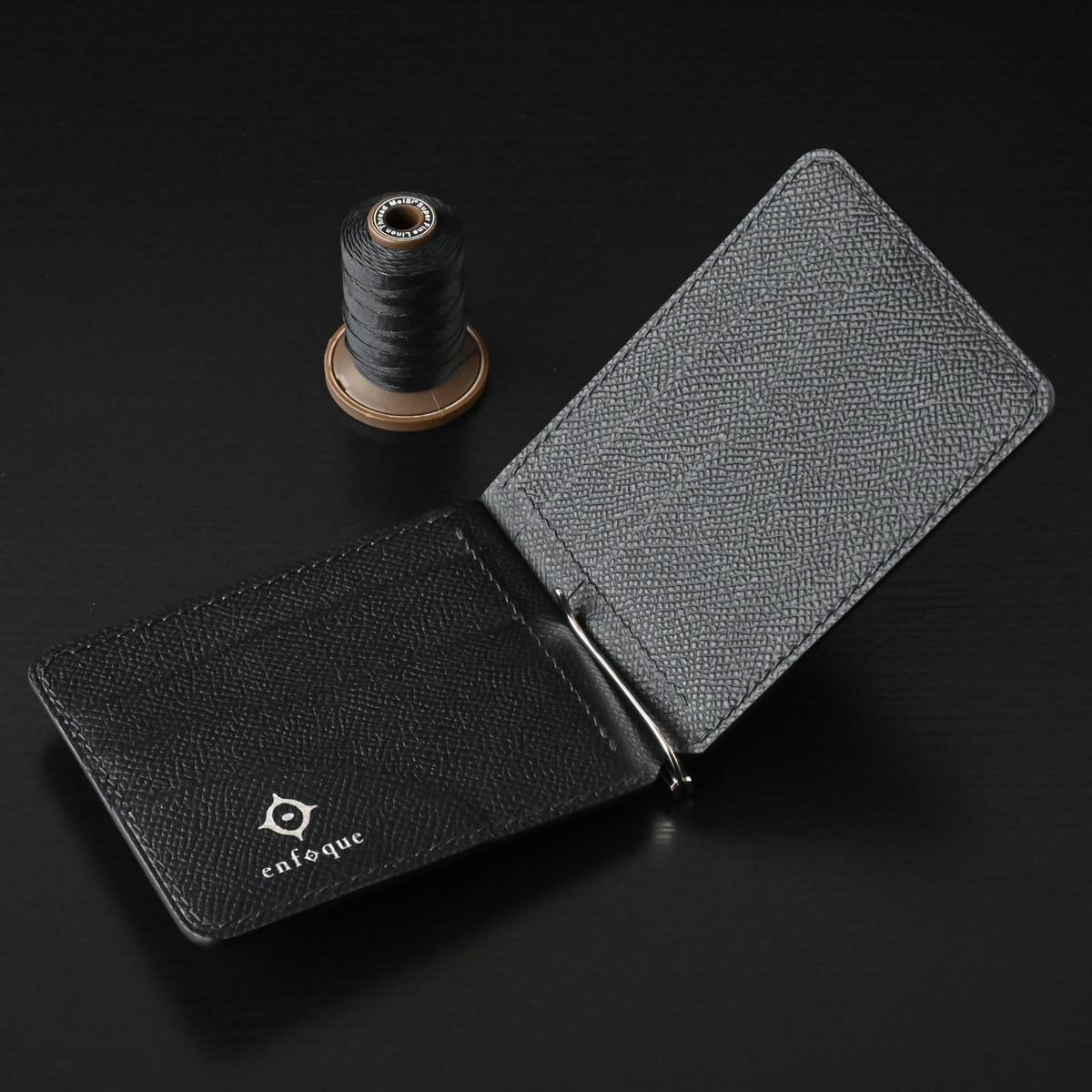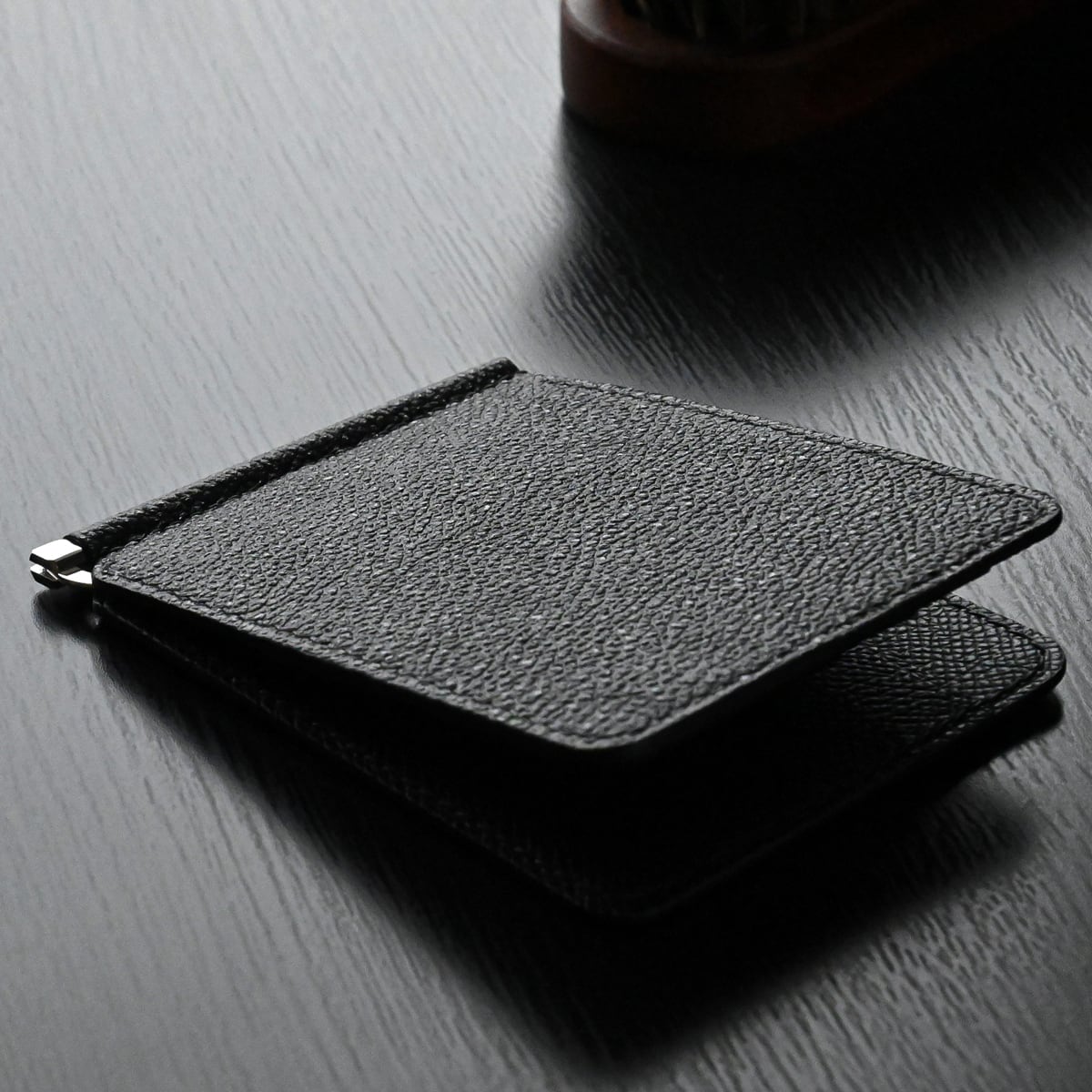 手縫い仕立てのマネークリップ財布【薄型 】 黒桟革&フレンチカーフレザー ブラック