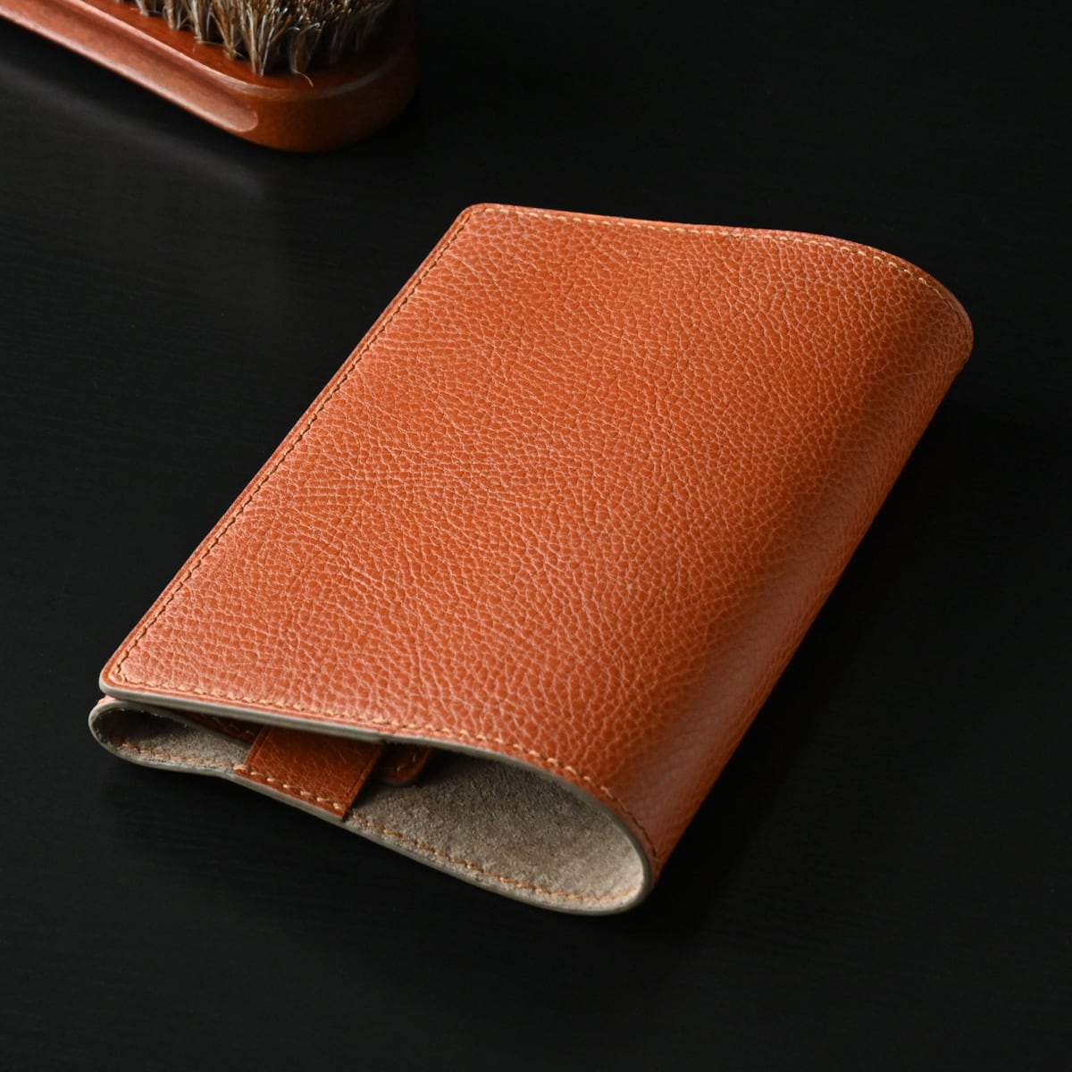天然皮革素材のため、個体差又は部位によりシボのない部分もありますが、オイルを含みしっとりとした触り心地で手に馴染む風合い、使うたびにだんだんと深みを帯び、艶も増して行きます。
