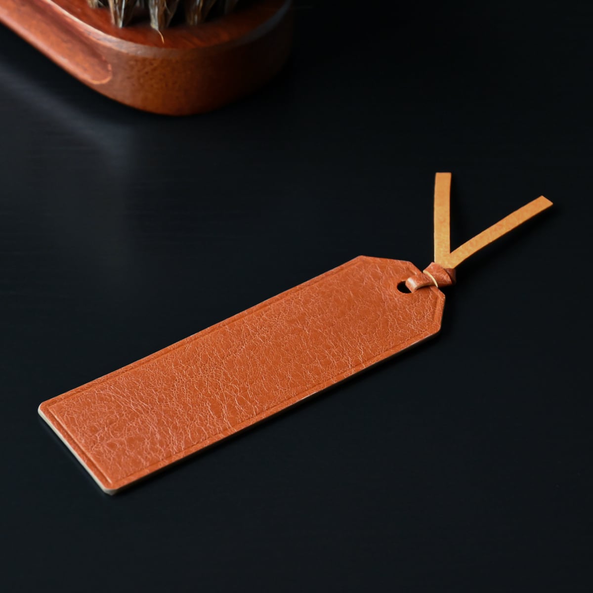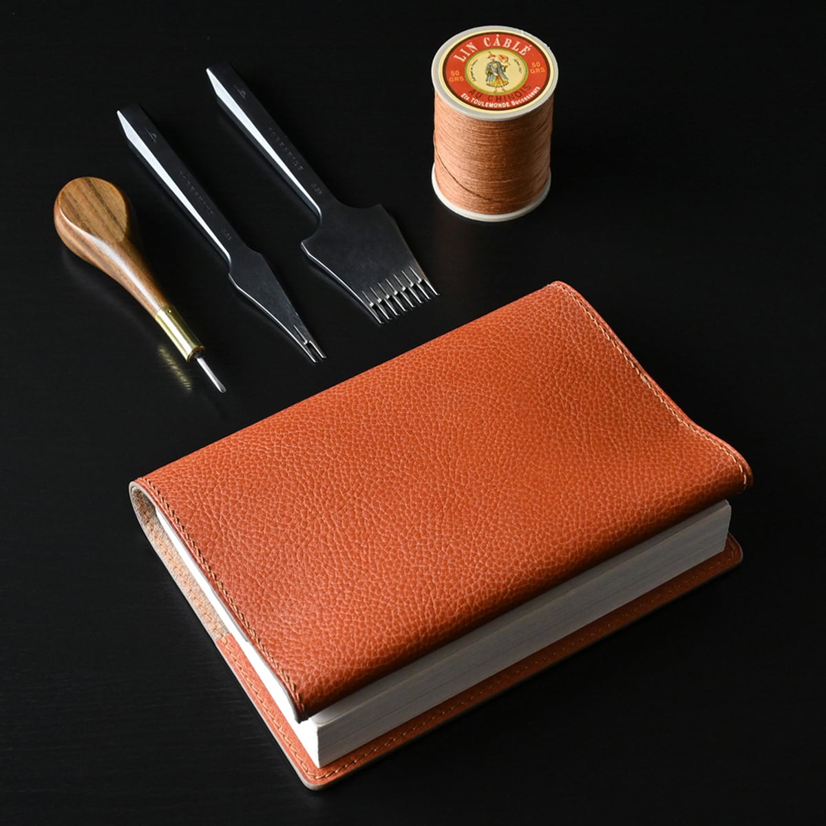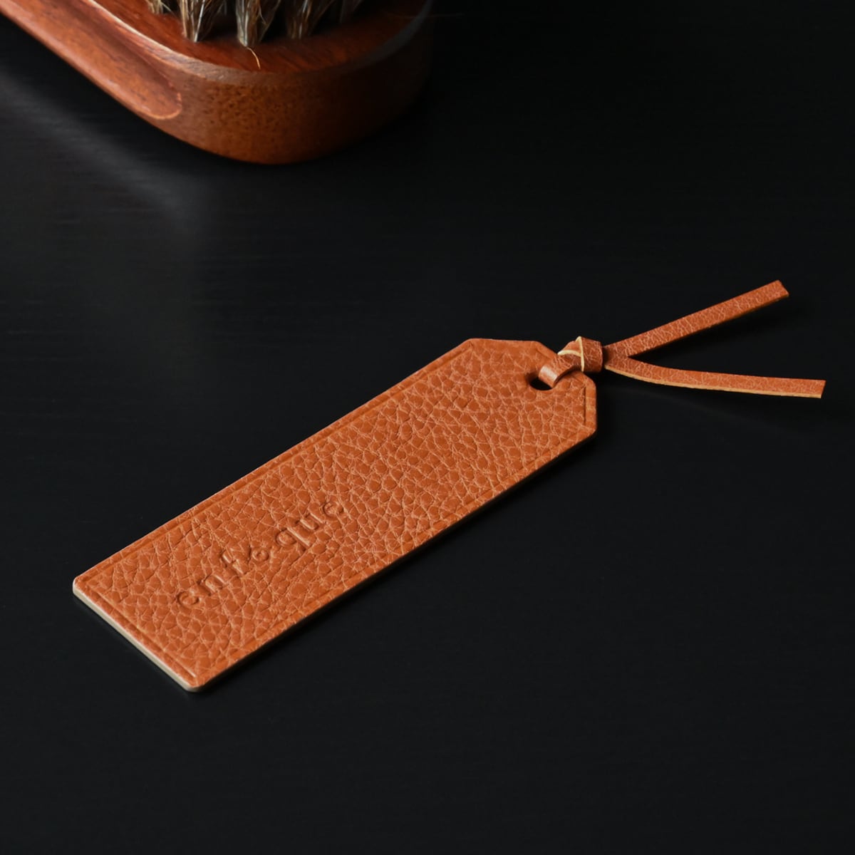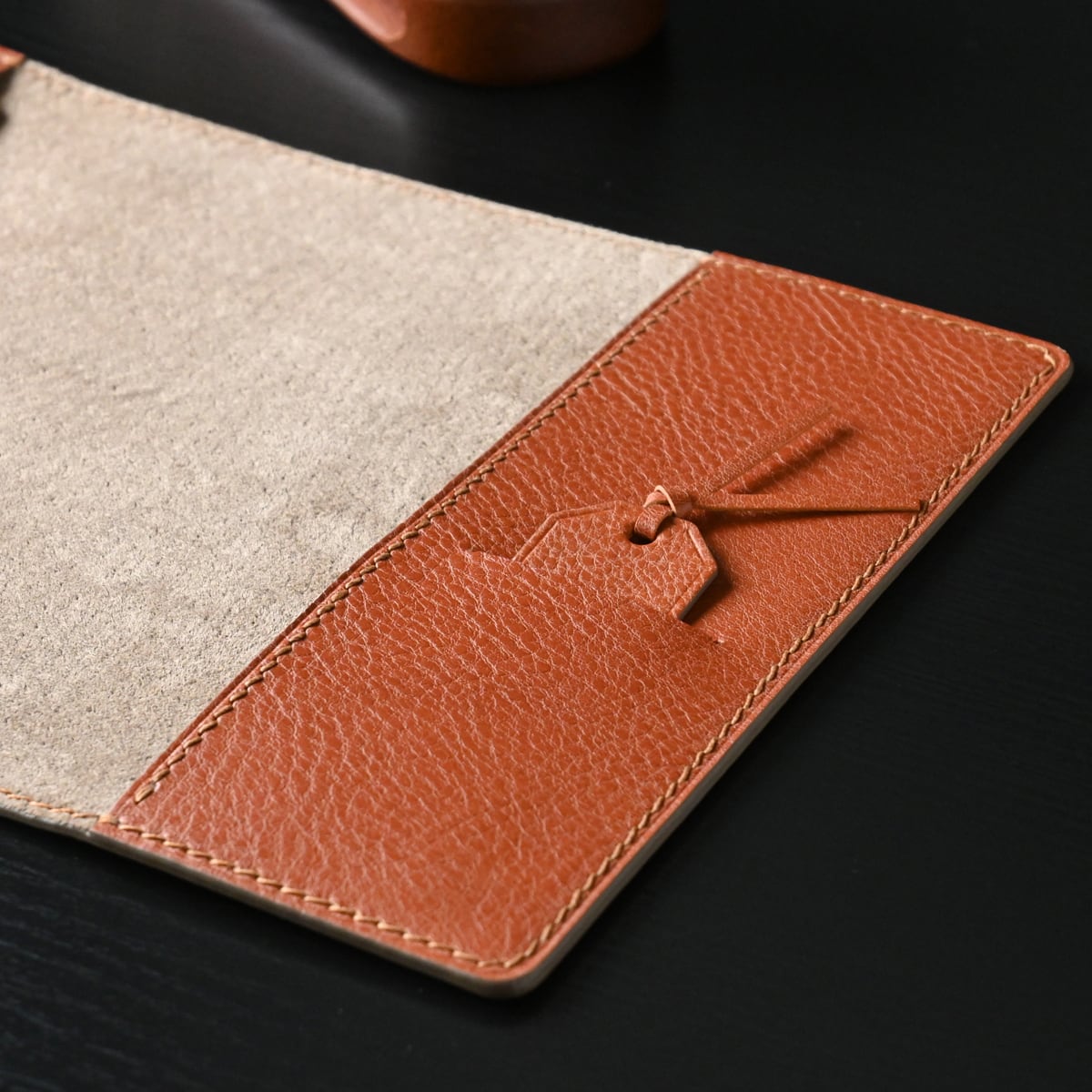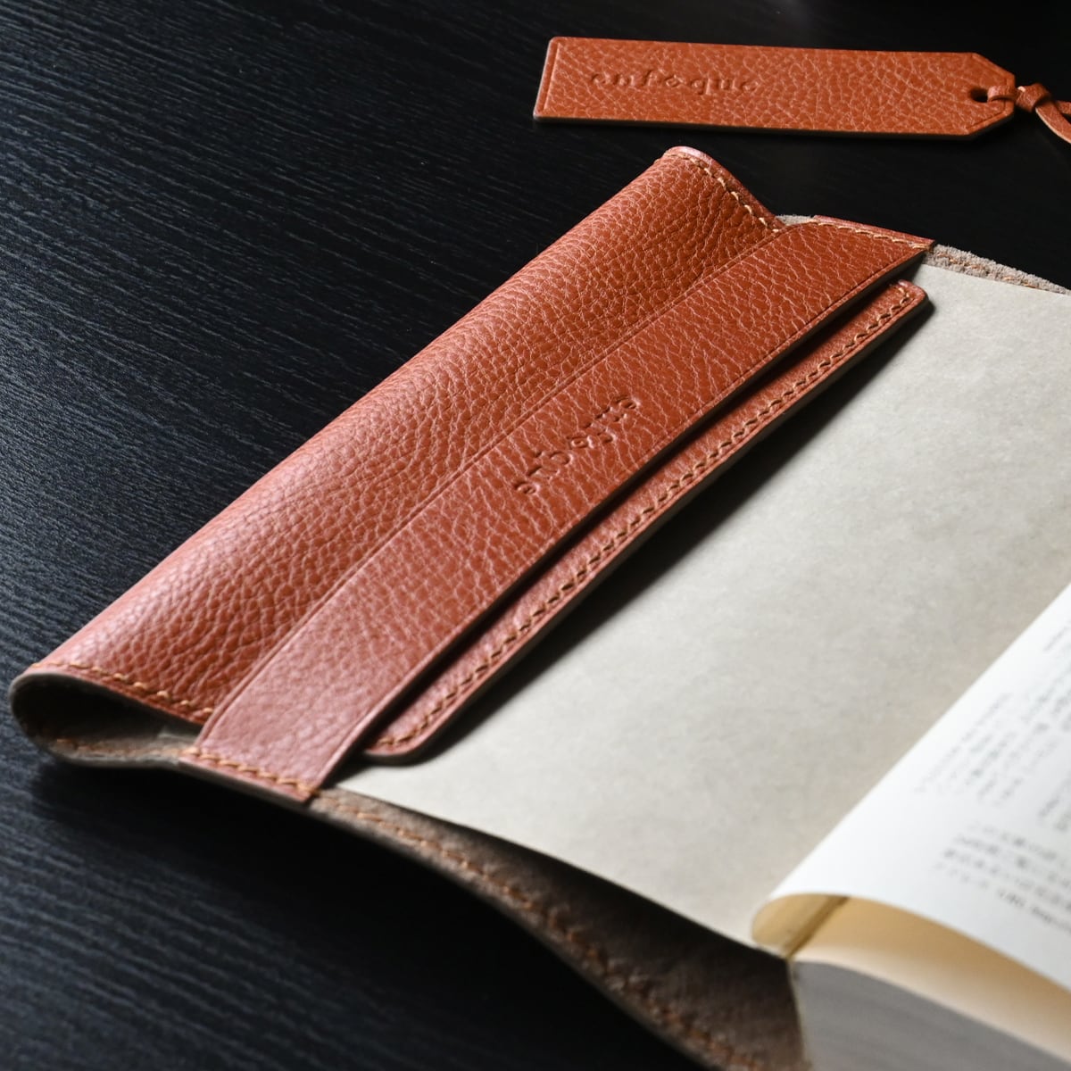 革の栞は両面イタリアンレザーを貼り合わせ、コバ面は水性コバ仕上げ剤にて仕上げし、イタリアンレザーの革紐で結んでいます。