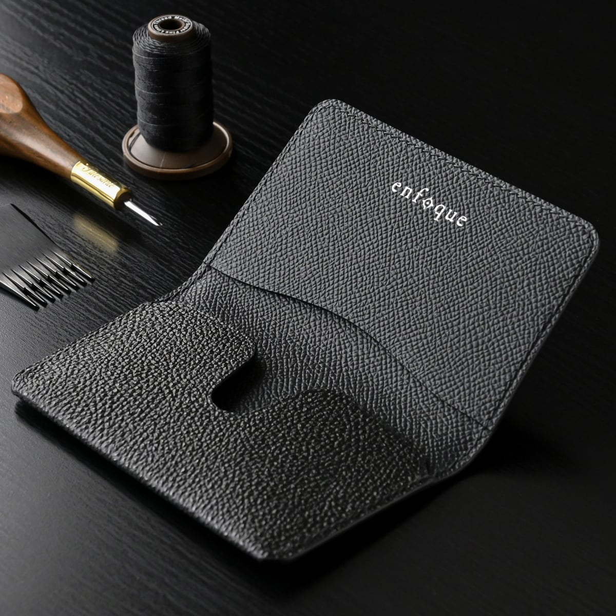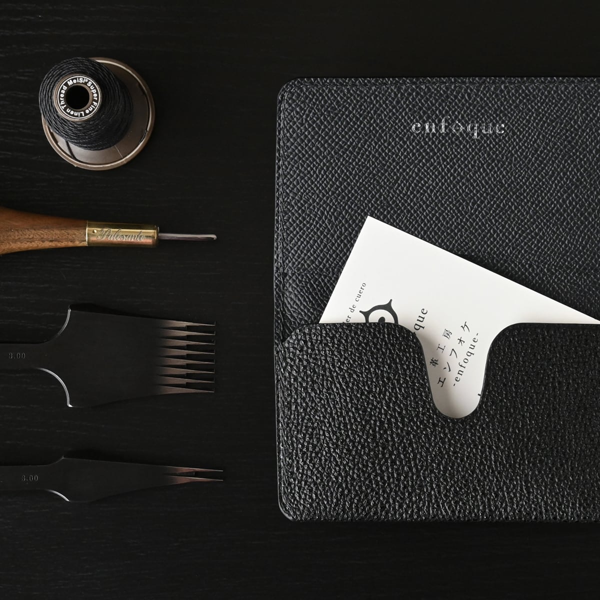 特徴として、日本の坂本商店が高い技術で創り出す”漆の光沢と高いシボ”を持つ黒桟革、スーパーメゾンでも採用されているフレンチカーフレザーを使用、パーツ裏面にも革を貼り、耐久性と共に贅沢に仕立てています。