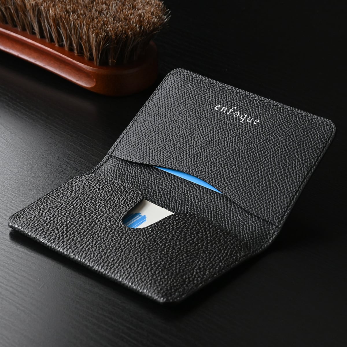 表に黒桟革、内部にフレンチレザーを使い、手縫いにて仕立てた“名刺入れ / カードケース”です。